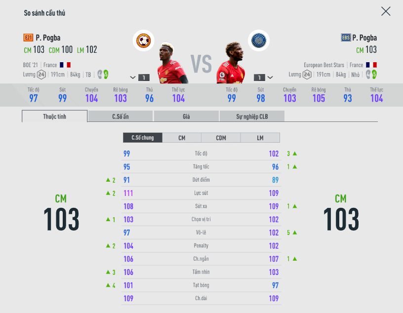 Một điểm nổi bật đó chính là thể hình của mùa giải BOE21 được xây dựng là trung bình, trong khi đó EBS chỉ là nhỏ. Đây là một lợi thế cực lớn cho Pogba trong các pha tranh chấp trên không và dưới mặt đất. Bất chấp chỉ số sức mạnh của EBS có nhỉnh hơn chút nhưng BOE21 vẫn tỏ ra cứng cáp hơn, cục súc hơn.