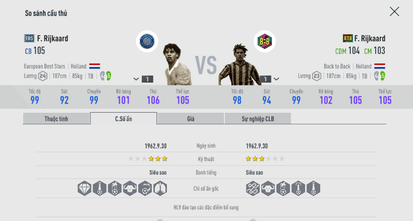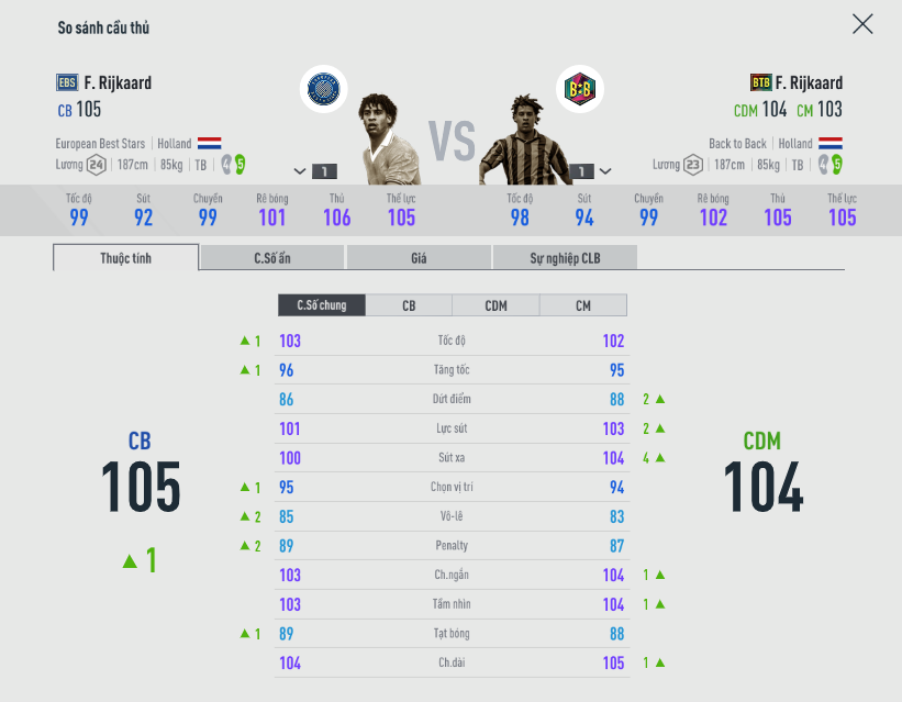 Sự khác biệt rõ nhất của hai thẻ đó là EBS được chỉ định đá ở CB trong khi BTB là CDM. Tuy chênh nhau 1 chỉ số tổng quát nhưng khi đưa về vị trí tương đương nhau thì EBS sẽ có chỉ số 104 tại CDM. Và có lẽ đa phần người chơi quen với việc Rijkaard đá CDM nhiều hơn là CB