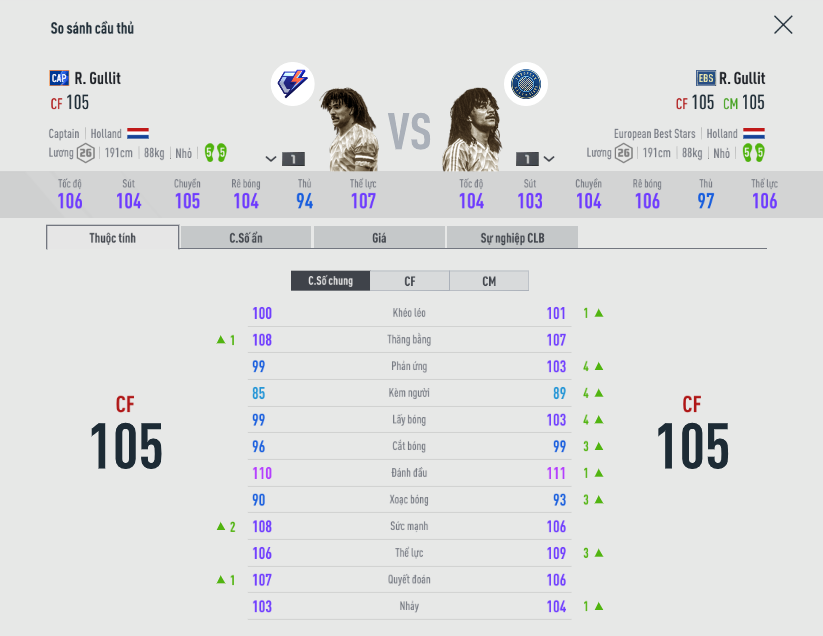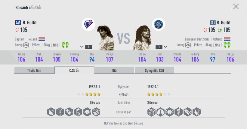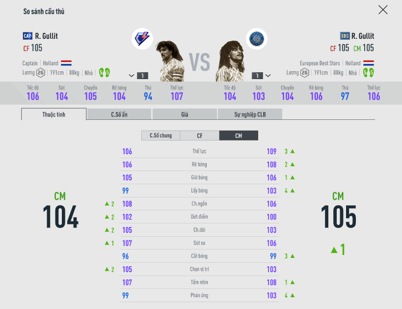 Hai mùa giải có cùng hệ số lương và chỉ số. Vô hình dung làm cho người chơi khó lựa chọn hơn, đặc biệt khi Gullit mùa Cap có cho mình chỉ số ẩn sút xa. Vậy thực hư mùa giải nào mới là lựa chọn đúng đắn.