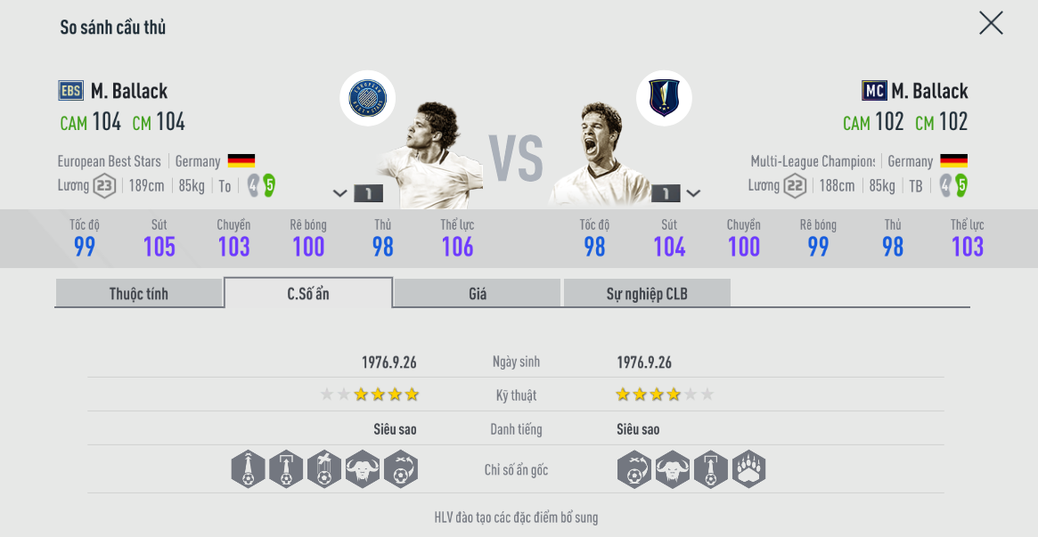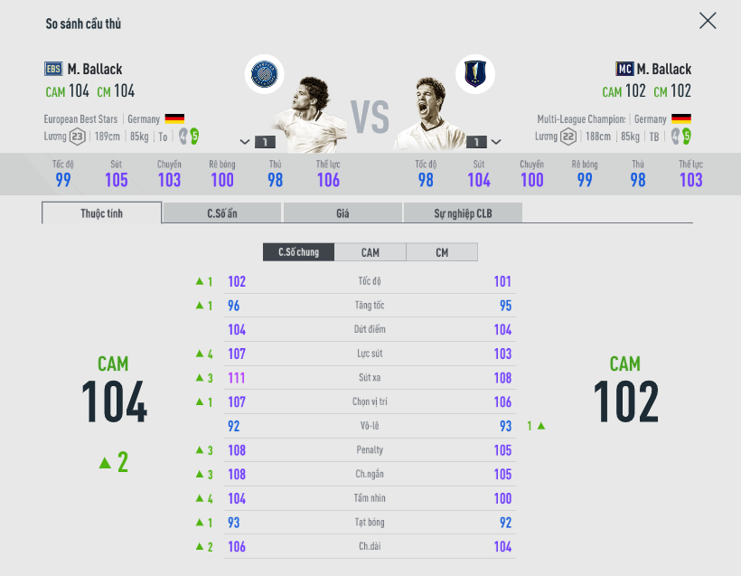 Mức giá của Ballack EBS lúc này đang gấp tới 15 lần so với MC. Và điều này cũng là một cân nhắc dành cho các bạn. Nếu dư dả hãy chọn EBS, nhưng nếu cần một cầu thủ chất lượng đã đi vào ổn định thì MC là một lựa chọn rất tốt. Không cần thiết phải nâng cấp lên.
