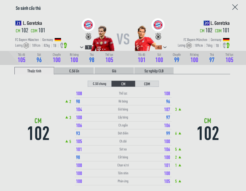 Hai mùa giải UCL được đánh giá cao của Goretzka được khá nhiều HLV "cày chay" ưa thích. Tất nhiên mùa giải ra sau luôn có chỉ số cao hơn và được nâng cấp về mặt chỉ số. Tuy nhiên hiệu quả thực chiến thì chưa chắc đã như những con số trên thẻ. Sau đây là những so sánh mà chúng tôi đánh giá dành cho Goretzka 21UCL và 20UCL