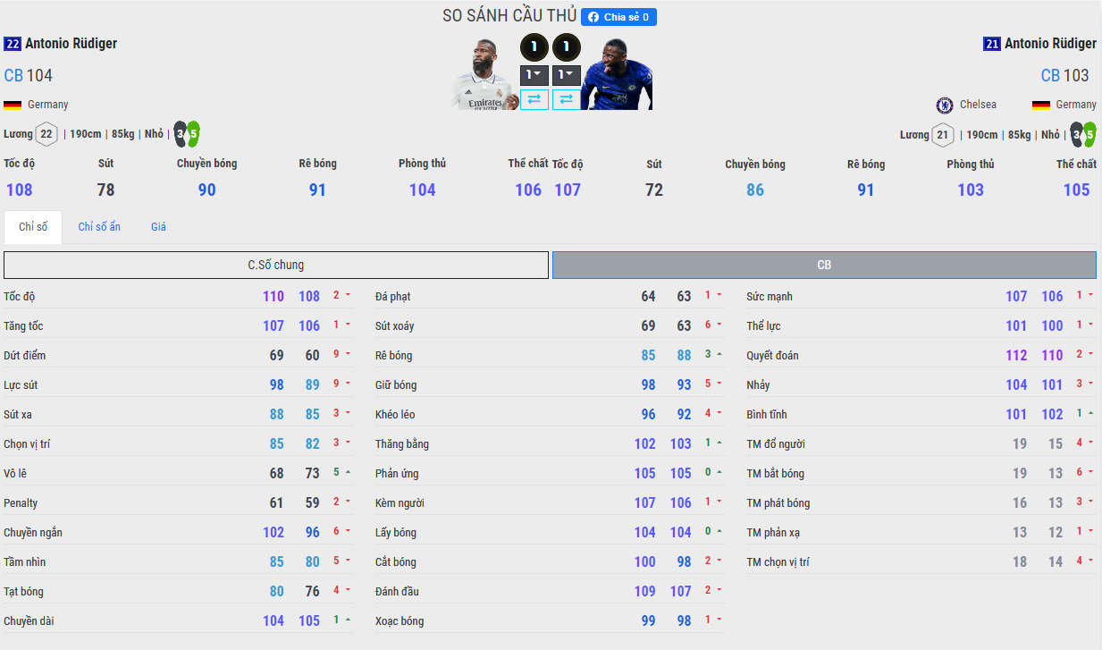 Chỉ thua kém có 1 ovr nhưng bộ chỉ số của 22UCL gần như vượt trội so với 21UCL, và tốc độ thì cá nhân tôi đánh giá là 22UCL nhình hơn một chút, không nhiều nhưng nó đủ để tạo ra những khác biệt trong các tình huống bám đuổi. Hơn nữa nếu Rudiger 22UCL được tăng chỉ số thì rõ ràng sự khác biệt sẽ rõ ràng hơn.