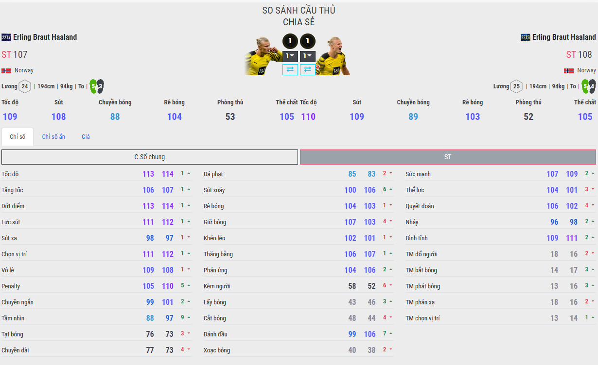 2. Dứt điểm : Haaland mùa 22TS dứt điểm tốt hơn, nó thể hiện rõ nhất ở khoản ZD khi bạn dùng 22TS thực hiện có khứa lòng bóng đi sẽ hiểm và chính xác hơn, cái này có lẽ là do sự ảnh hưởng lớn tù chỉ số ẩn sút xoáy và tránh xài chân không thuận. 22TY luôn cố gắng dứt điểm bằng chân trái - chuẩn thuận của anh chàng này, nên nhiều trường hợp lại tự đưa mình vào thế khó.