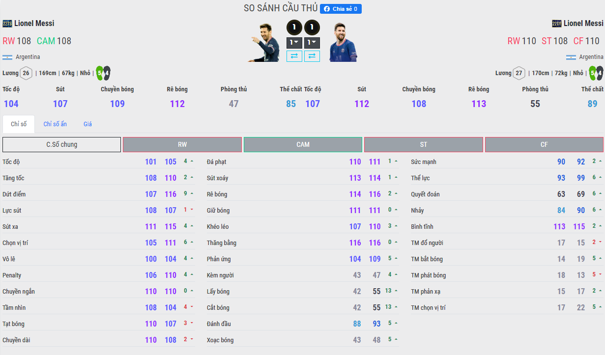 Đầu tiên là chỉ số Over của hai mùa có sự khác biệt khá rõ. Nhưng nên nhớ Messi 22TY được định hình là RW, ST và CF trong khi đó 22TS là CAM và RW. Từ đây nó cũng có sự khác biệt rõ rệt