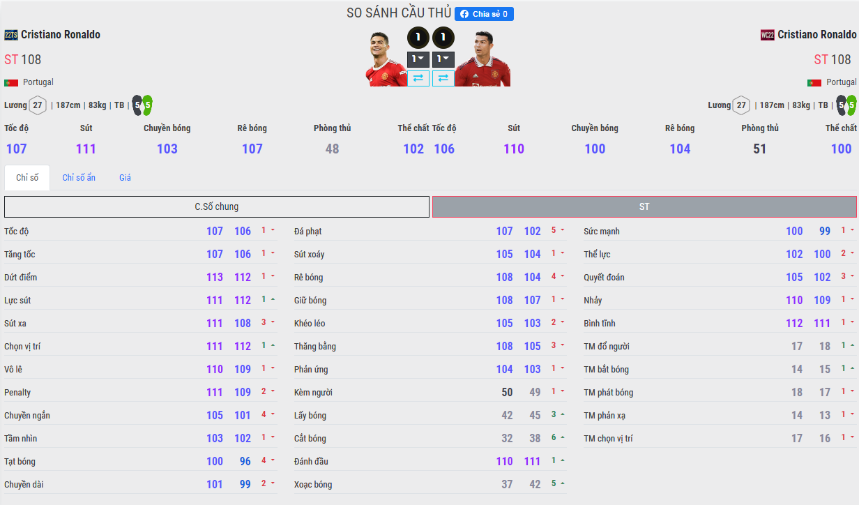 Có thể nhận thấy mặc dù cùng một chỉ số Ovr 108, nhưng các chỉ số thành phần của Ronaldo WC22 lại thua kém rất nhiều ở các khâu như chuyền bóng, tạt bóng, sút xa, rê bóng...các yếu tố về mặt thể chất, kỹ thuật thì không thay đổi gì.