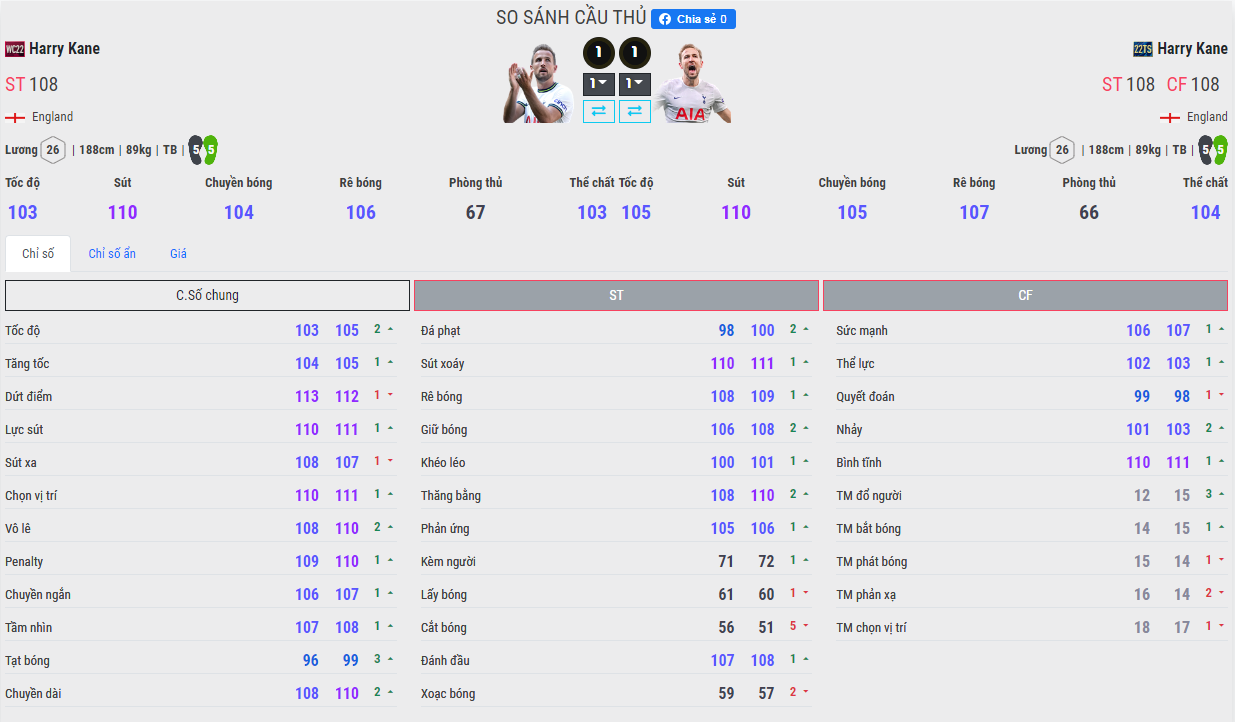 Sự khác biệt ngay đầu tiên khi bạn nhìn vào chỉ số của hai mùa giải là mùa 22TS của Kane có thêm chỉ số vị trí CF trong khi đó WC22 là thuần ST, do khi trở về khoác áo đội tuyển quốc gia thì Kane mặc định đá cắm và các cầu thủ khác phải có trách nhiệm bơm bóng cho anh.
