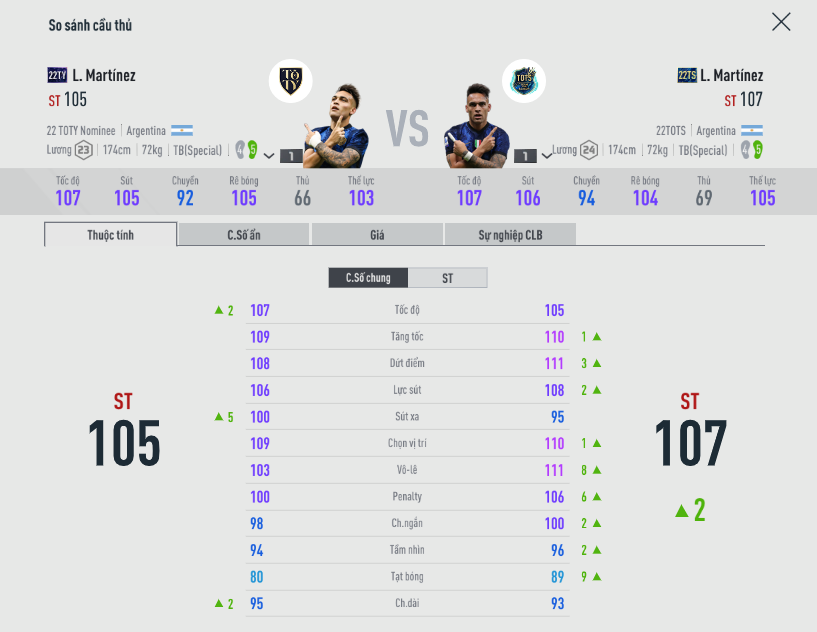 2. Dứt điểm : dứt điểm của mùa 22TY là tốt hơn, và nó thể hiện rõ nhất ở khoản dứt điểm ZD ở gameplay này, tuy nhiên nếu dứt điểm 1vs1 thông thường trong vòng cấm thì 22TS lại tốt hơn, nếu bạn là người chơi theo lối căng ngang từ cánh vào để Martinez băng vào vole hay băng cắt thì 22TS lại phù hợp hơn