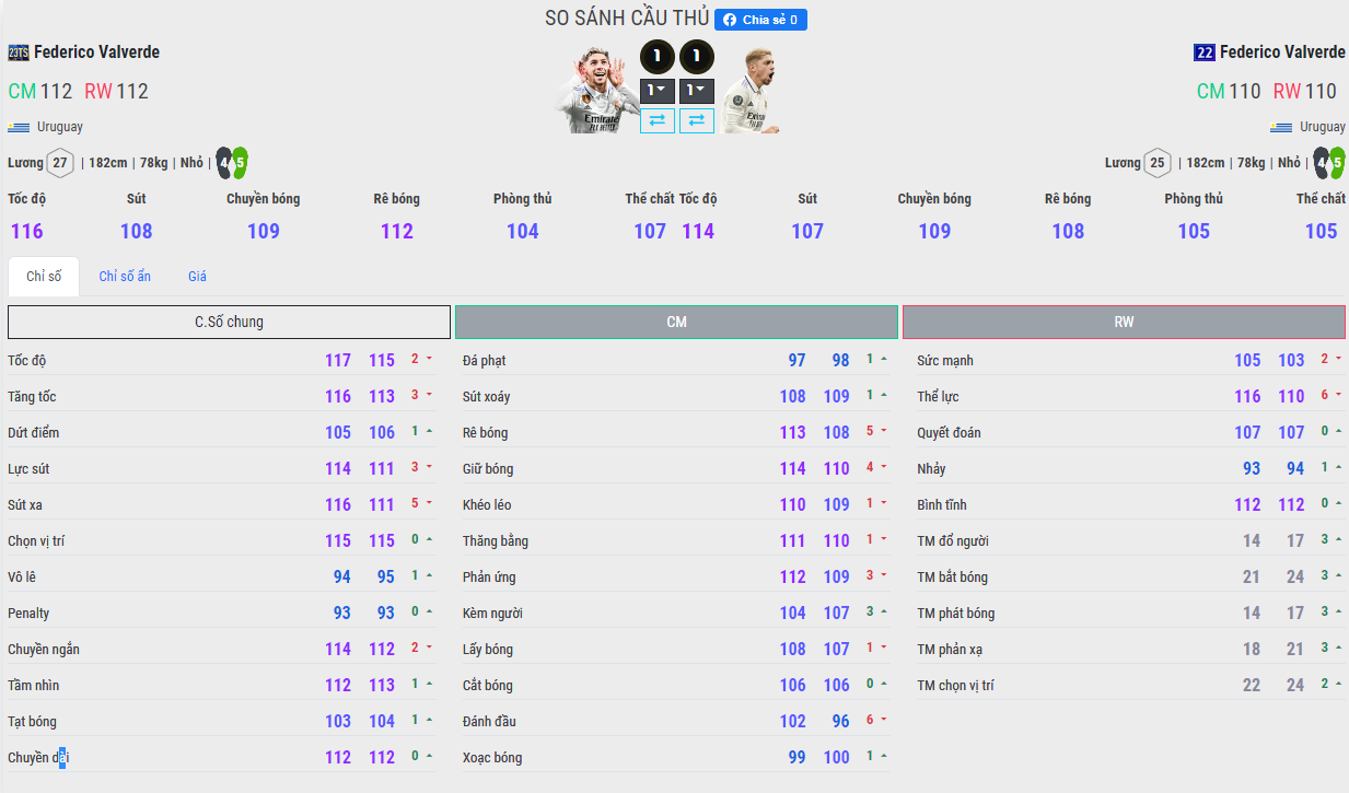 Federico Valverde đã có một mùa giải 22UCL thành công với việc chỉ số của anh này tăng liên tiếp từ khi bắt đầu vòng 1/16 cho tới bán kết. Có thể nói rằng với mức lương 25 thì rõ ràng chỉ số 110 là khá hời với những ai chơi team Real Madrid, chưa kể Valverde lại chơi ở vị trí tiền vệ trung tâm nhưng có tốc độ của một tiền đạo.