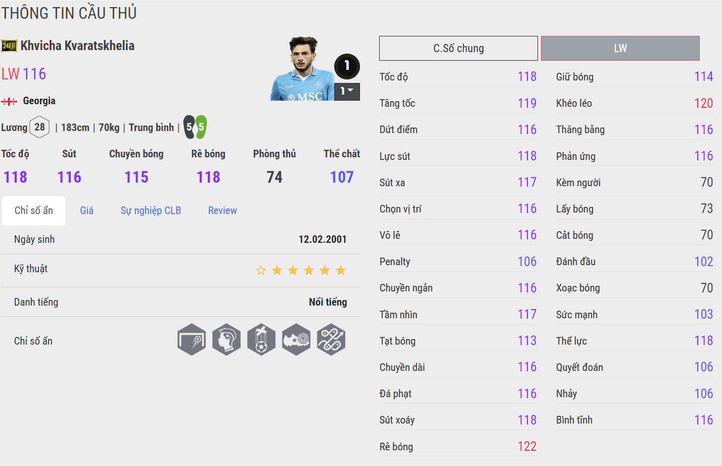 Cải thiện thể chất ấn tượng tạo nên sự lì đòn trong các tình huống tranh chấp của Kvaratskhelia, mùa 24EP đang cho thấy hiệu quả nổi bật từ thể lực dồi dào, khả năng thăng bằng tốt, tì đè và che bóng hiệu quả hơn so với mùa 23TS. Đây thật sự là mùa thẻ đáng dùng cho Kvaratskhelia ở thời điểm này.