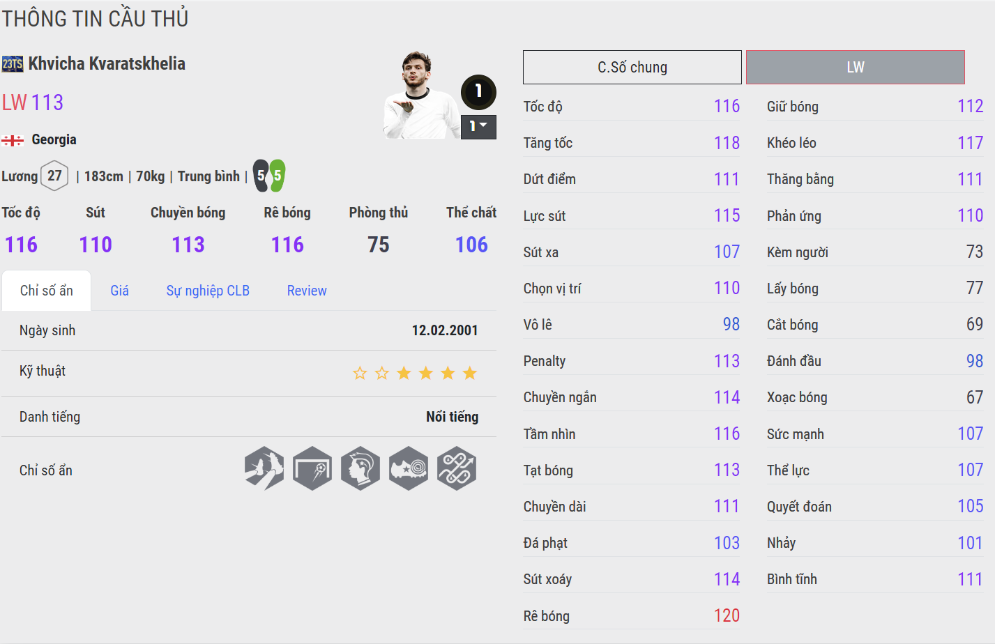 Kvaratskhelia rê dắt khá ấn tượng. Tuy nhiên điểm nổi bật vẫn nằm ở mùa 24EP khi anh sở hữu 5 sao kỹ thuật cũng như cảm giác về giao động trong game của Kvaratskhelia lại cũng rất ổn định. Tốc độ rê dắt nhanh, động tác chân thanh thoát, khả năng xoay sở khá ấn tượng.