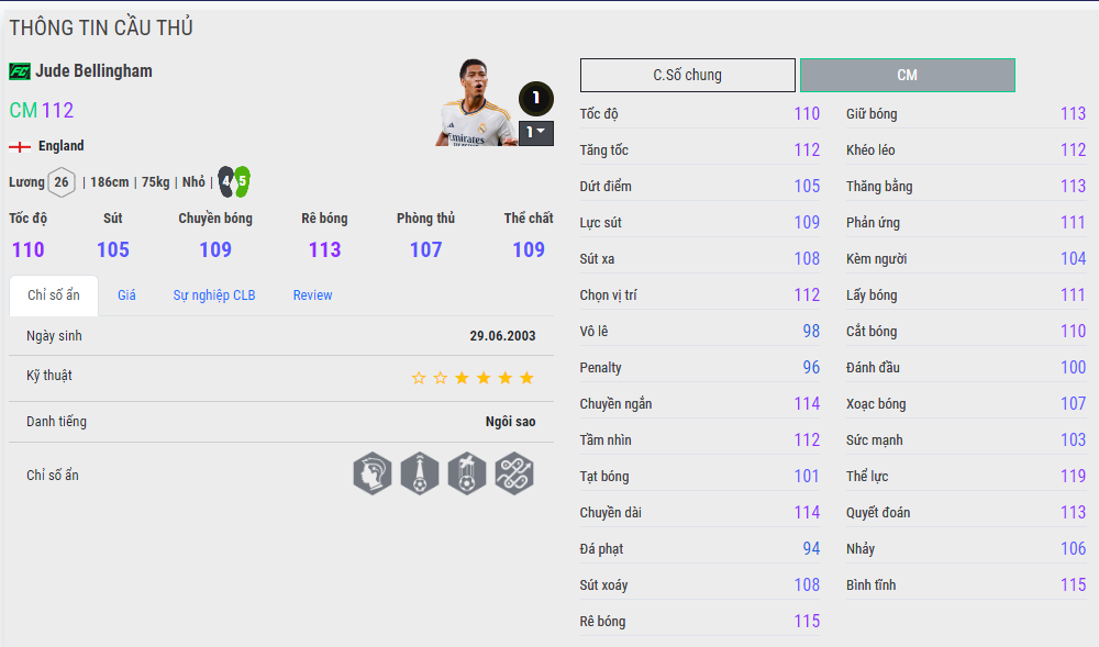 Jude Bellingham FC Ambassador có thêm một chỉ số ẩn là chuyền dài, thêm vào đó Ai của mùa giải này cũng được Nexon nâng cấp thành ngôi sao, thay vì nổi tiếng như mùa 23TOTS, điều này cũng ít nhiều tạo ra sự khác biệt một chút trong các tình huống chuyền bóng của Jude Bellingham, đặc biệt là chuyền dài, khi tính đột biến sẽ được tăng lên.