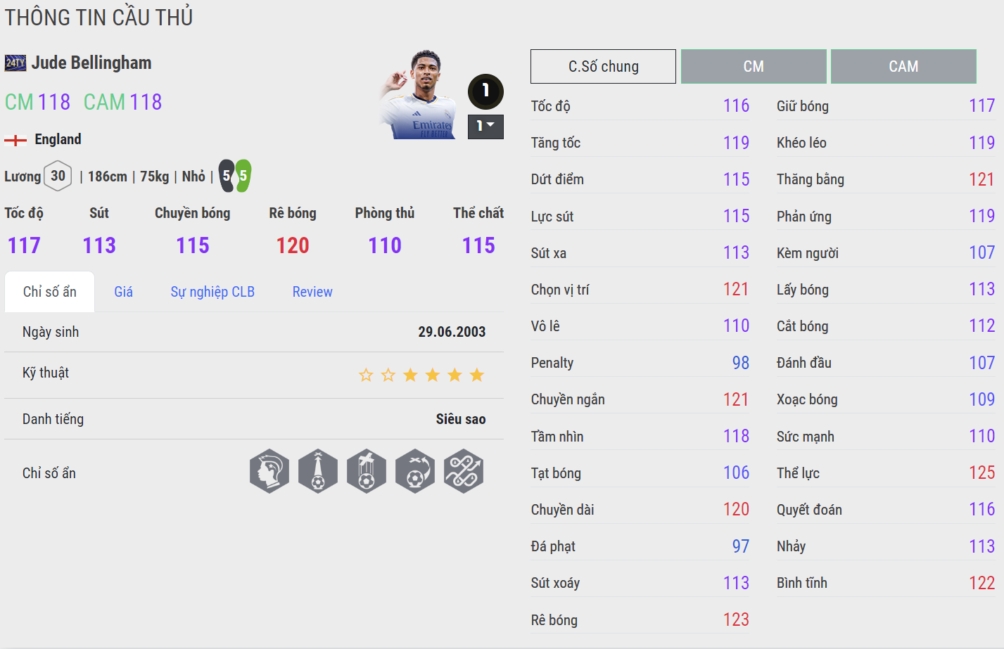 Trong game, 2 phiên bản Bellingham 24TY và 24TS đều cho thấy chỉ số rất cao và tiềm năng sử dụng nổi bật. Dù phiên bản 24TS mới chỉ xuất hiện thời gian ngắn nhưng đang được nhiều HLV đánh giá rất cao.