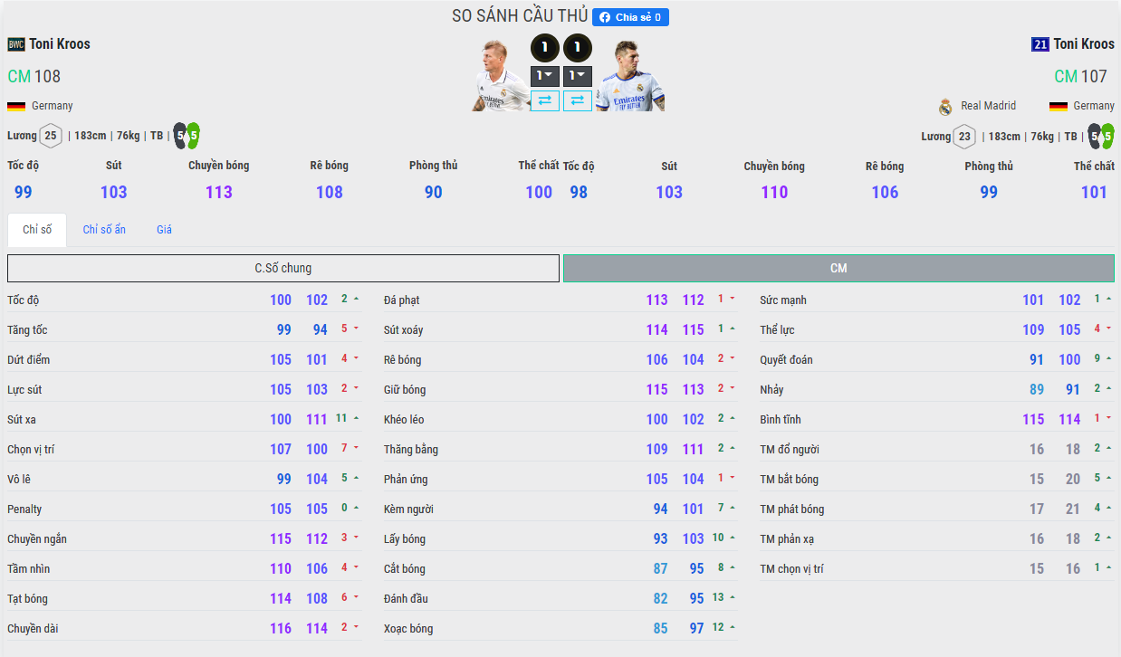 Toni Kroos BWC có chỉ số tăng tốc tốt hơn, nhưng trên sân thì thực tế không tạo ra sự khác biệt với mùa 21UCL. Bản thân Kroos cũng chưa bao giờ được đánh giá là mẫu tiền vệ nhanh hay cơ động ở giữa sân cả. Vậy nên về tiêu chí này nó không quá quan trọng.