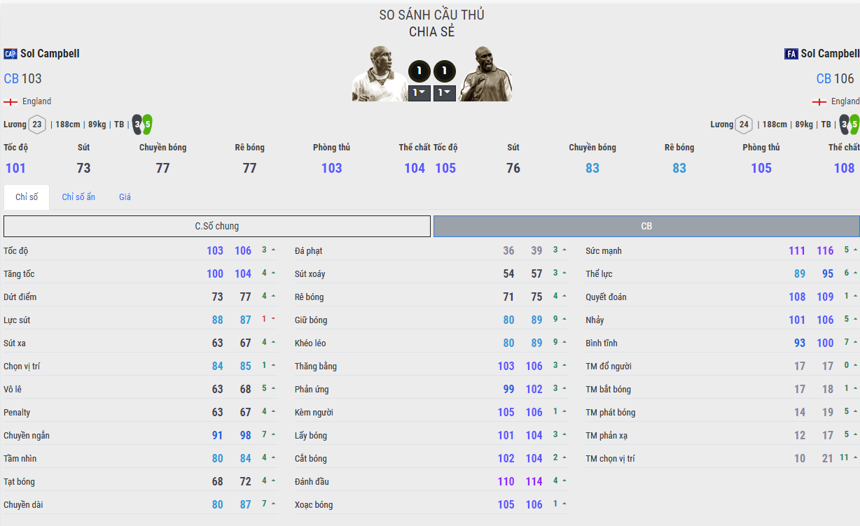 Mùa FA của Sol Campbell có chỉ số lên tới 106, ngang bằng với cả mùa ICON của huyền thoại này. Thế nhưng chất lượng của thẻ cầu thủ thì không hẳn đã được như chỉ số, liệu mùa FA có hơn được mùa CAP đang được đánh giá là mùa thường hay nhất của Campbell hay không ?