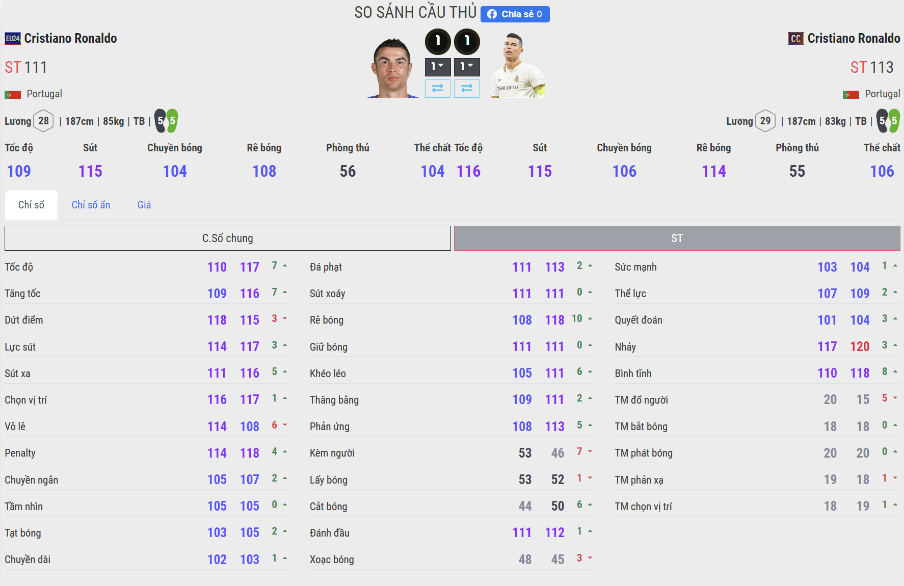 Có thể thấy rõ, tốc độ của mùa CC là vượt trội hơn hẳn, ở các phiên bản gần đây thì CC là mùa thẻ có tốc độ và khả năng di chuyển cục kì tốt. Trong khi đó EU24 có phần chậm, hơi thiếu hiệu quả và cần khả năng nháy Q để CR7 xuất phát trước nhằm lấy lợi thế.