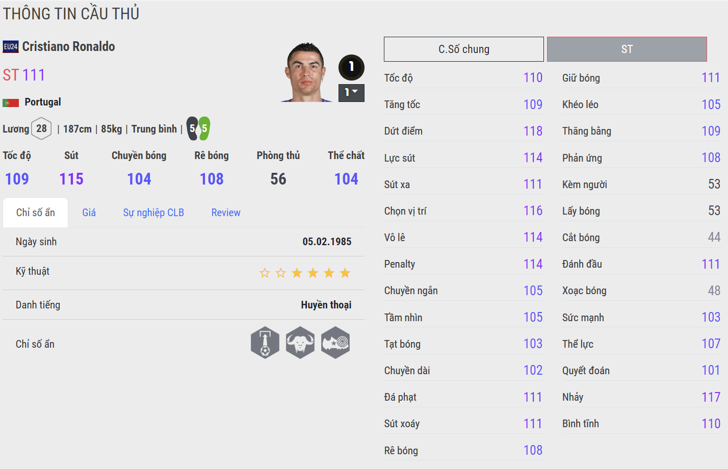 Khả năng chuyền bóng của Ronaldo ở mức ổn, không quá nổi bật nhưng cũng cho thấy hiệu quả tốt, tròn vai. Ở điểm này, dù cảm giác ingame mùa CC có phần nhỉnh hơn nhưng không quá đáng kể và phiên bản EU24 vẫn cho thấy giá trị tốt.