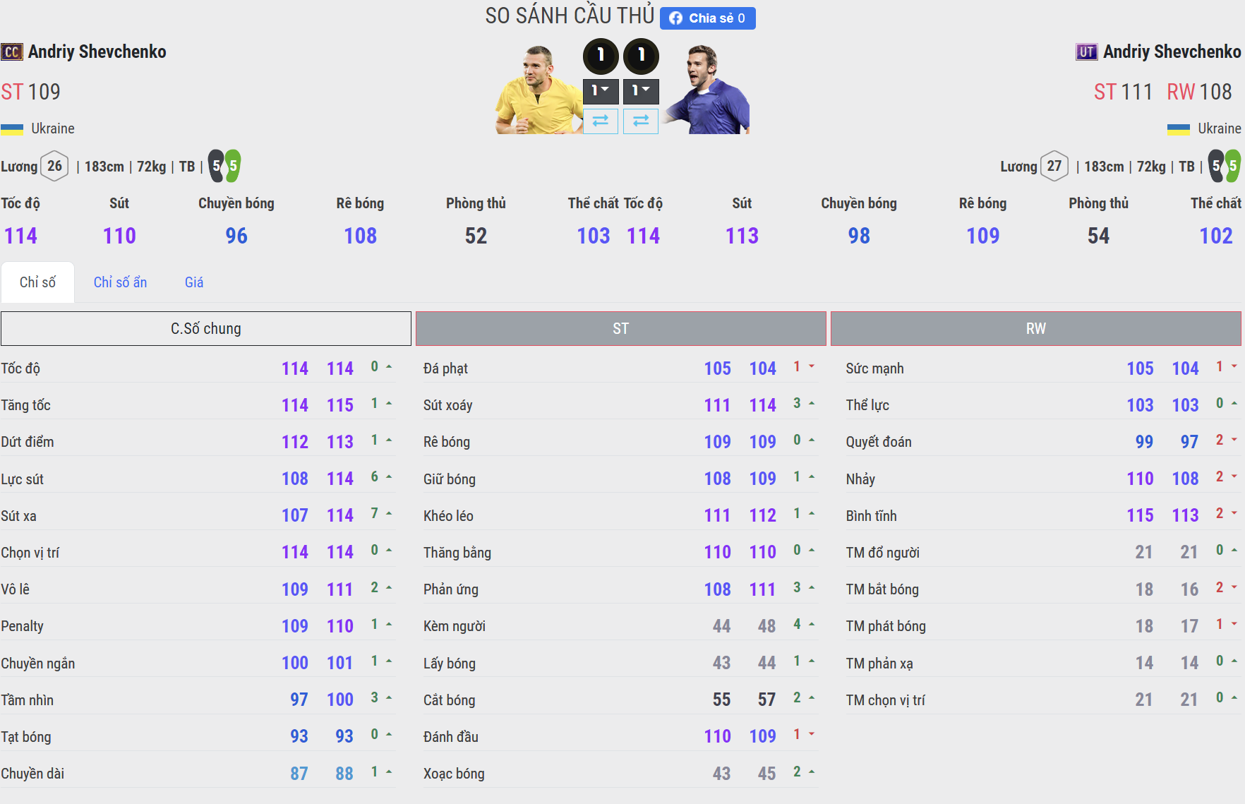Nếu đánh giá về tốc độ, cảm giác cả 2 phiên bản không có nhiều sự khác biệt, kỹ năng bứt tốc, di chuyển của Shevchenko đều là rất nhanh và hiệu quả. Dù không phải ở top đầu nhưng giá trị mang lại của Shevchenko là cực kì ấn tượng.