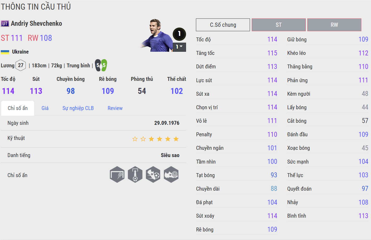 Shevchenko được đánh giá là một trong những mẫu tiền đạo chất lượng có giá trị sử dụng cao ở nhiều phiên bản khác nhau. Khả năng thích nghi tốt với nhiều loại meta cùng với đó là sở hữu 2 team color khủng Chelsea và AC Milan giúp cho Shevchenko là cái tên rất đáng chú ý trong FC Online.