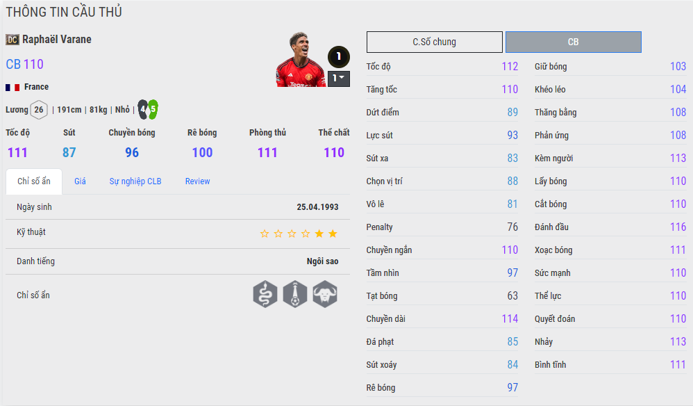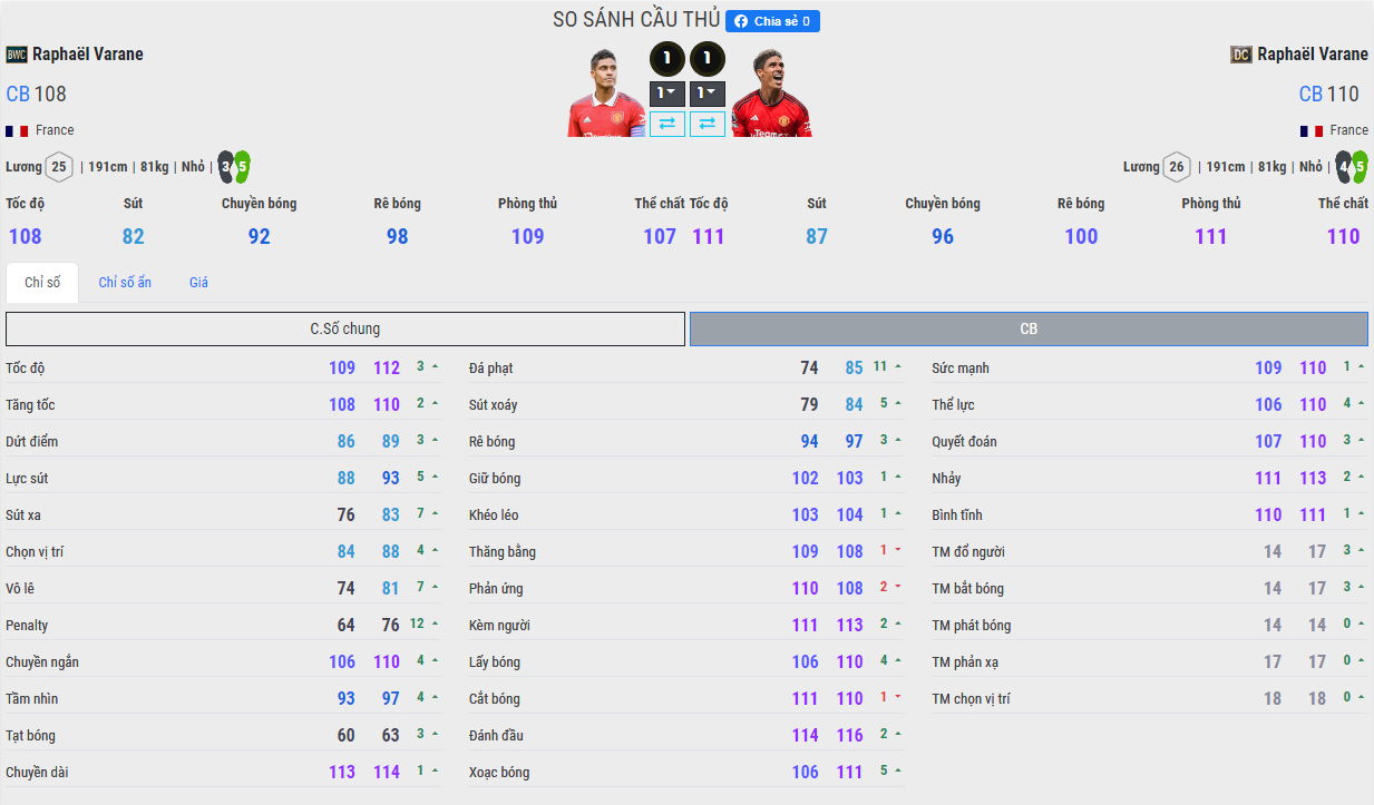 Cùng sải chân nhưng độ chính xác trong các pha tackle bóng của Varane BWC cũng tốt hơn. Nhưng có một chi tiết mà tôi xin được nhấn mạnh là Varane BWC tackle bóng bằng chân phải thì ổn hơn so với DC, còn chân trái thì...chưa chắc. Nguyên do là Varane DC có chân trái 4 sao trong khi mùa BWC chỉ có 3. Điều này tưởng chừng khá vô thưởng vô phạt nhưng nó sẽ tác dụng khá lớn nếu như bạn sử dụng hai trung vệ có cùng chân thuận trong đội hình, lúc đó Varane DC có thể đá LCB còn mùa BWC thì khá mạo hiểm.