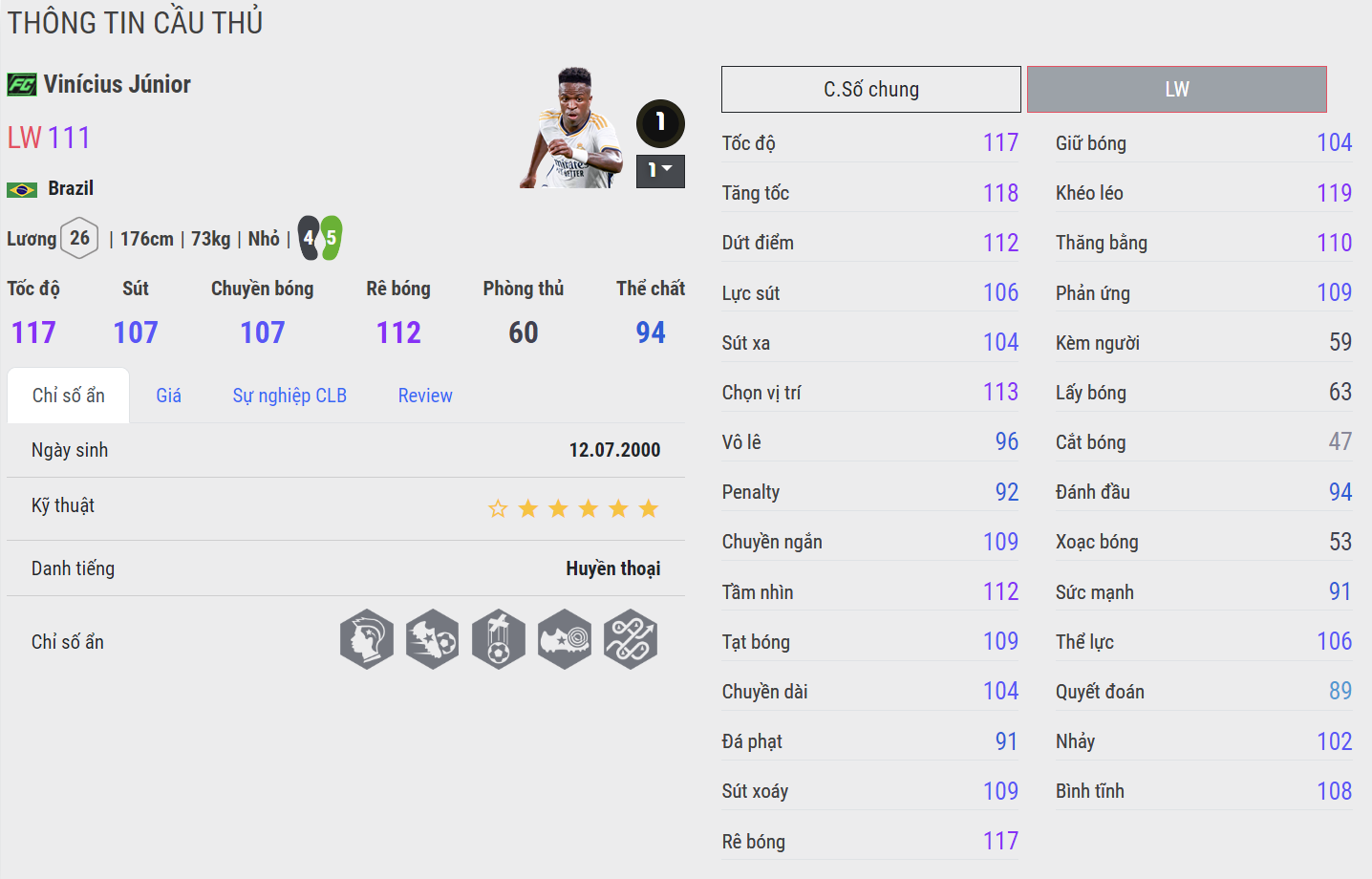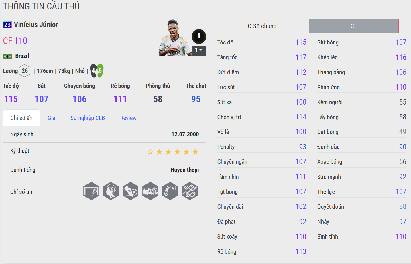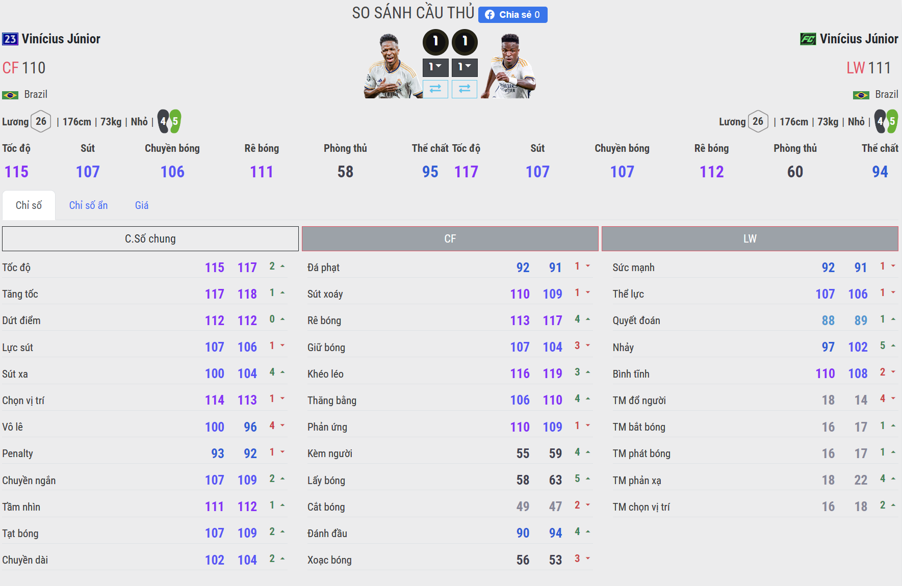 Tốc độ của Vinicius ở cả 2 phiên bản đều rất nhanh. Tuy nhiên, cảm quan về khả năng tăng tốc ở mùa FC nhỉnh hơn 1 chút so với mùa thẻ 23UCL. Dù vậy thì nó cũng không quá đáng kể và Vinicius ở cả 2 phiên bản đều sở hữu một tốc độ vượt trội.