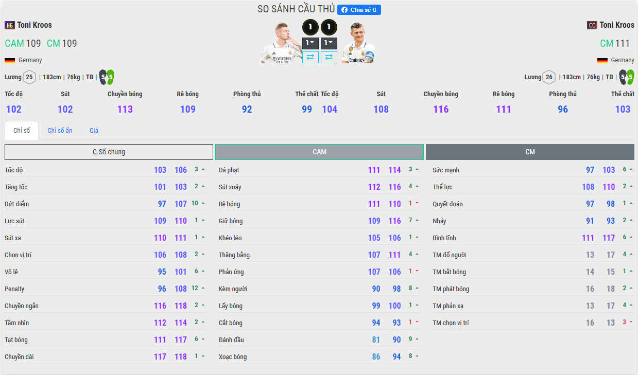 nếu bạn nhìn vào chỉ số sẽ thấy chỉ số dứt điểm của mùa CC là cao hơn HG, và nó thực sự có tác dụng tới hiệu suất săn bàn của tiền vệ Real Madrid. Với các tình huống dứt điểm đơn giản trong vòng cấm, sự khác biệt là không cảm nhận được, nhưng với các tình huống sút xa thì bạn sẽ thấy rằng hiệu quả mà Toni Kroos CC đem lại là tốt hơn hẳn.