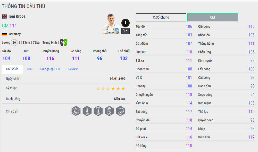 Toni Kroos nổi bật trong tựa game FC Online từ mùa giải 21UCL và từ đó cho đến nay tuyển thủ Đức này vẫn được coi là một tiền vệ CDM CM tốt nhất với kỹ năng chuyền bóng cả hai chân và chuyền cực chính xác, điều đó vẫn được duy trì và không có thay đổi gì với mùa giải CC so với HG cả.