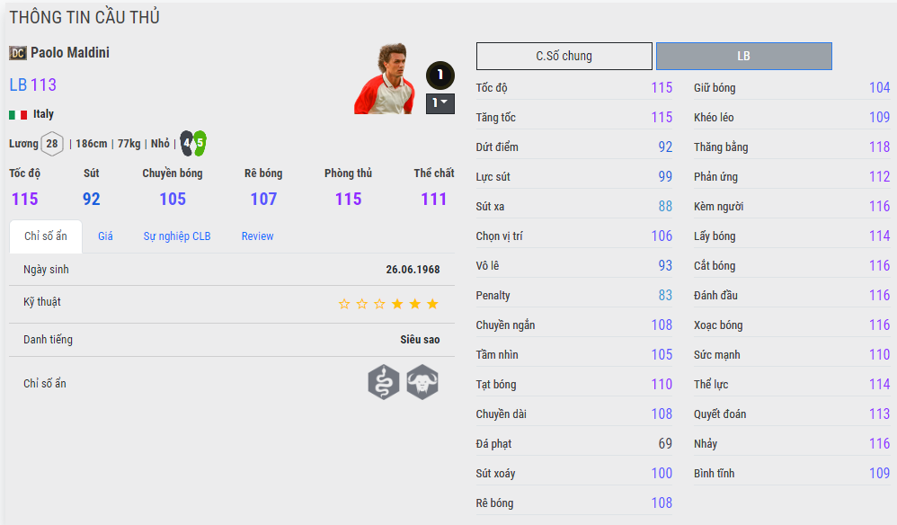 Paolo Maldini là cái tên rất hay trong FC Online, mỗi mùa giải mới ra mắt mà có sự góp mặt của trung vệ huyền thoại này thì gần như anh luôn nằm trong top các trung vệ hàng đầu của mùa giải đó. AI của Paolo Maldini chưa bao giờ làm người chơi thất vọng. Tuy nhiên sau quãng thời gian dài rút kinh nghiệm với Paolo Maldini NHD trước đây, Nexon đã không tạo ra những mùa thẻ có giá trị sử dụng quá dài nữa.