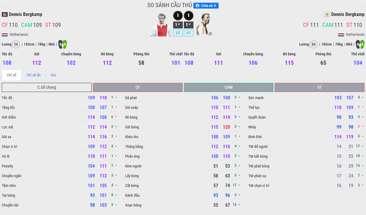 Trên bảng chỉ số chúng ta sẽ thấy mùa ICON hơn mùa HG tới 6 chỉ số, nhưng ngược lại khi thi đấu thì HG mới là mùa có tỷ lệ dứt điểm tốt hơn. Cái chính là nằm ở hai chân 5/5 của mùa HG cho phép Bergkamp HG đa dạng góc sút hơn. Thêm vào đó AI của mùa HG rõ ràng đang tỏ ra hơn hẳn so với mùa ICON ở khâu chạy chỗ và xâm nhập vòng cấm.