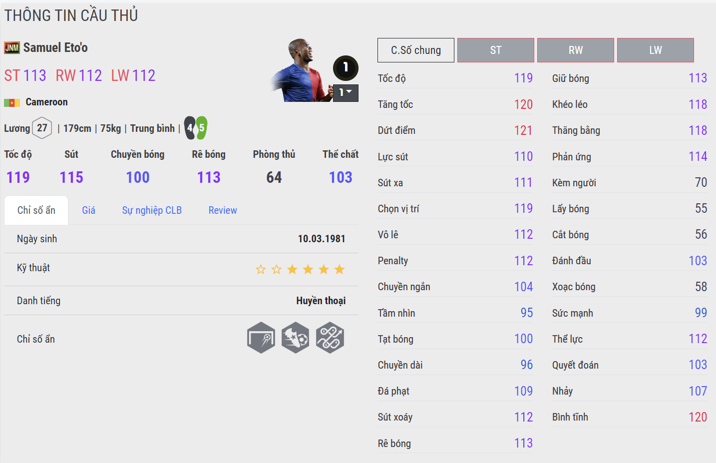 Samuel Eto'o được đánh giá là một trong những tiền đạo cực kì hay ở FC Online thời điểm hiện tại. Báo đen của Châu Phi đang cho thấy sự hiệu quả và hợp meta đến bất ngờ. Điều này khiến cho nhiều HLV giành sự quan tâm lớn khi Eto'o có cho mình nhiều team color chất lượng như Real, Barca, Chelsea, Inter Milan...