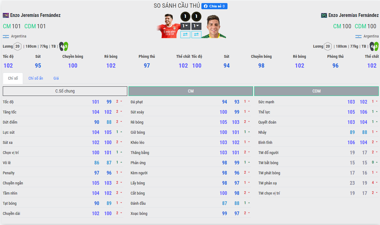 Trong FIFA Online 4, Enzo có hai mùa giải khá hay là SPL và 22NG có cùng mức lương nhưng có chỉ số chênh nhau 1 đơn vị. Tất nhiên, nhìn vào loạt chỉ số ẩn thì khá nhiều người sẽ thích 22NG hơn, tuy nhiên chất lượng của các mùa giải NG luôn là một dấu hỏi lớn với đa phần người chơi FO4. Vậy có thức ự là 22NG là mùa giải tốt hơn SPL với Enzo Fernandez hay không ?