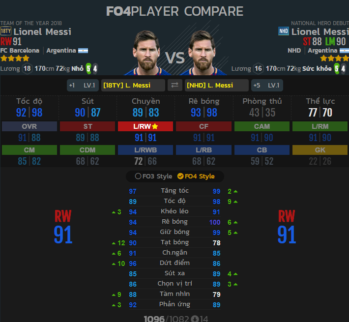 Lý do cho việc so sánh Messi NHD và Messi TOTY Messi TOTY chắc chắn có lợi thế khi nhìn vào bộ chỉ số của cả 2 thẻ mùa giải. Tuy nhiên có những chi tiết phải cân nhắc như mức lương, giá cả cũng như vóc dáng khi ở trên sân.Trước hết, Messi TOTY có mức lương cao hơn Messi NHD là 2. Với việc phải cân bằng mức lương tổng thể của cả đội bằng cách tiết kiệm số lương cho từng vị trí thì giảm bớt 2 cũng là điều cần thiết để những vị trí còn lại có thêm lương cho những cầu thủ chất lượng hơn. Mức giá của cả 2 cũng là không thể bỏ qua khi mức giá của Messi NHD là 1tr8 bp thấp hơn khá nhiều so với mức giá 43tr bp của Messi TOTY. Cùng với việc thể hình “Sức khoẻ” và thăng bằng 96 sẽ khiến Messi NHD khó bị đẩy ngã hơn Messi TOTY với thể hình nhỏ và chỉ số thăng bằng thấp hơn. Messi TOTY có lợi thế về mặt chỉ số từ chuyền ngắn, tầm nhìn sút xoáy, tăng tốc, phản ứng, sức mạnh, thể lực,sút xa, chọn vị trí, sút phạt, chuyền dài, giữ bóng … so với việc Messi NHD có nhiều chỉ số thấp hơn, khiến cho chỉ số chung thấp hơn.