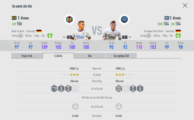 Mùa giải BTB sút tốt hơn, và do có vẻ thi đấu cao hơn so với EBS và có chỉ số ẩn sút xoáy nên hiệu quả mà những cú đại bác của Kroos BTB tốt hơn hẳn. Điều đặc biệt là Kroos thuận cả hai chân nhé các bạn.