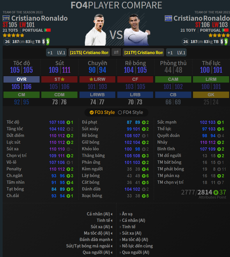 Trên mặt chỉ số mùa 21TY nhanh hơn 1 điểm, nhưng tăng tốc chậm hơn chút xíu, thật ra không có sự khác biệt nào ở đây về mặt thực tế trong game cả, hai mùa đều cho một Cr7 nhanh và bứt tốc rất tốt.