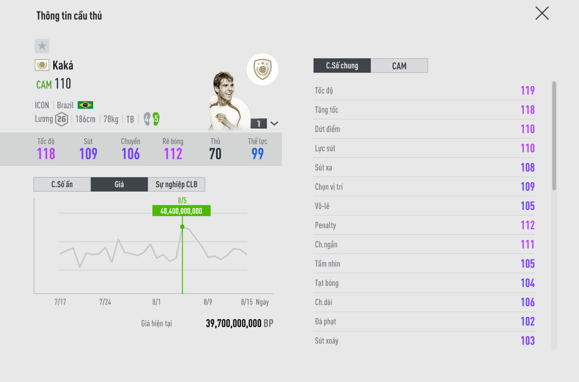 Giá trị cao nhất của Kaka tại sever chúng ta chỉ là mức 48B thấp hơn rất nhiều so với tại máy chủ Nexon. Tất nhiên việc có sự chênh lệch này là do cách dùng cũng như xu hướng lựa chọn cầu thủ của mỗi sever khác nhau. Ở Việt Nam thì thích những tiền vệ có thể hình và tốc độ cao nhiều hơn là những cầu thủ chơi thiên về kỹ thuật như Kaka.
