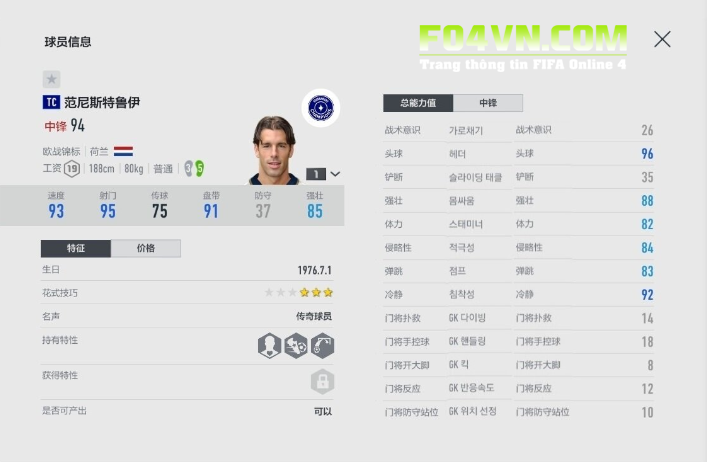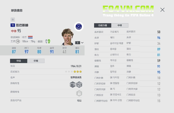 Khả năng nhảy 83 và đánh đầu 96 và chiều cao vô cùng lý tưởng, Van Gol sẽ là cái tên đáng chú ý cho lối chơi không chiến.