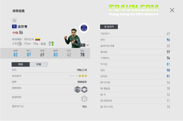 Không phải là một trong những cầu thủ có thể hình tốt nhưng khả năng không chiến của Falcao chưa bao giờ thua kém. Chọn vị trí tốt, bật nhảy 98 và đánh đầu 96 hứa hẹn anh sẽ là một cái tên thú vị mùa TC .