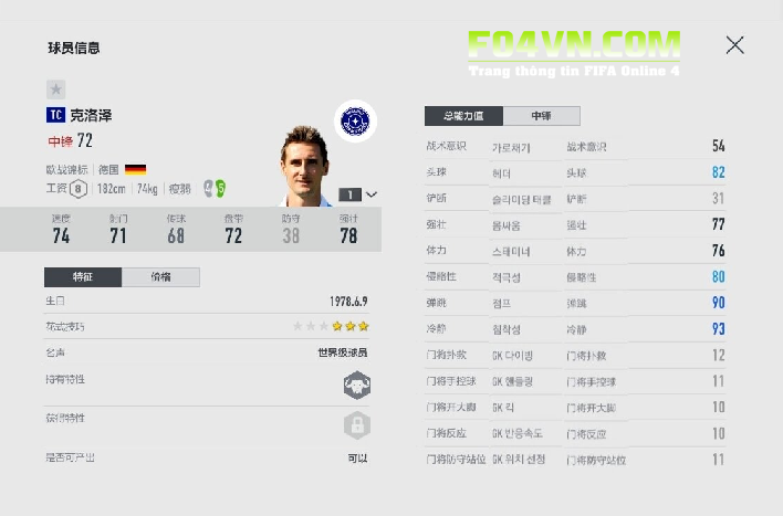 Chỉ số không quá cao, tuy nhiên Klose vẫn cho thấy mình là chuyên gia không chiến hàng đầu với chỉ số bật nhảy 90 và đánh đầu 82. Một chỉ số rất cao cho một cầu thủ có OVR chỉ là 72.