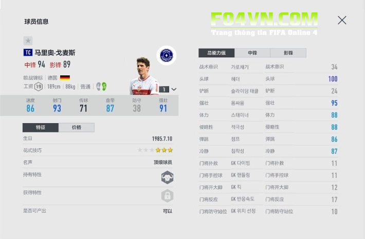 Sinh ra cho lối chơi không chiến, thể hình to khỏe, khả năng bật nhảy 86 cùng chỉ số đánh đầu 100. Gomez còn có cho mình chỉ số ẩn đánh đầu mạnh. Dự đoán anh sẽ nằm trong top những con hàng không chiến hay nhất game.