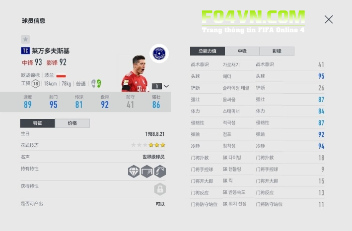 Không có chỉ số ẩn đánh đầu mạnh, tuy nhiên Lewandowski vẫn là một trong những Oanh tạc cơ được quan tâm bởi chỉ số bật nhảy 92 và đánh đầu 95 của mình.