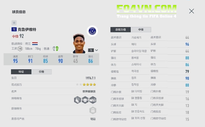 Chỉ số bật nhảy 98 cùng khả năng đánh đầu 96. Kluivert có một chỉ số bật nhảy cực kì khủng so với một cầu thủ có chiều cao 1m88. Điều này thực sự biến anh thành con quái vật không chiến.Liệu đây có phải là sự trở lại của Kluivert phiên bản Legend FO3 với khả năng "đè đầu cưỡi cổ" các trung vệ trong những tình huống không chiến hay không?