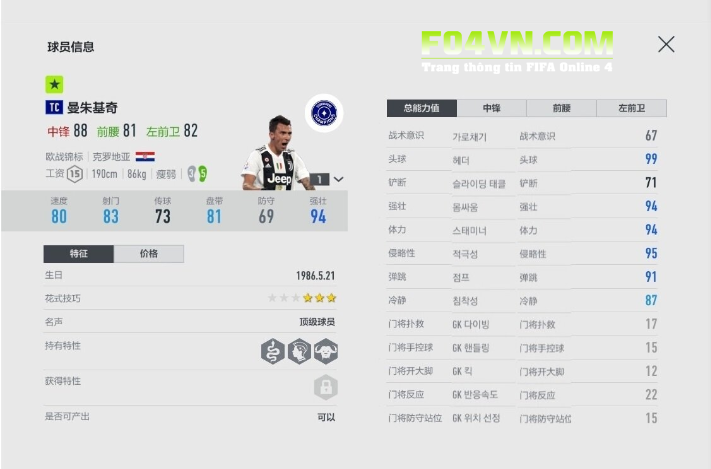 Cầu thủ không chiến hay nhất của đội tuyển Croatia với chỉ số bật nhảy 91 và đánh đầu lên tới 99 hứa hẹn là một cái tên không thể bỏ qua.