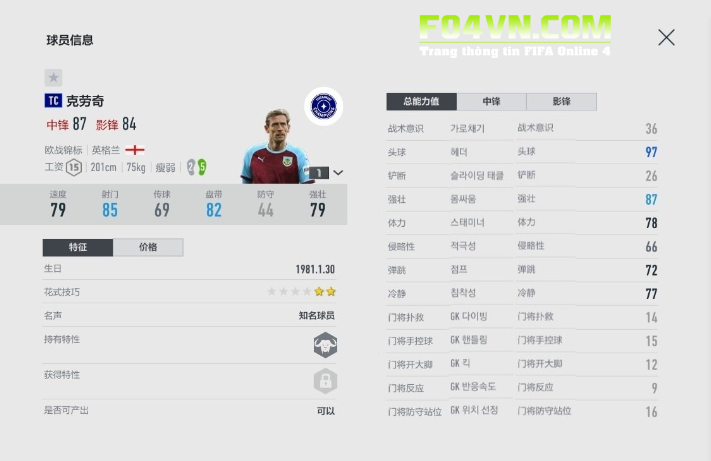 Chàng tiền đạo cao 201cm có chỉ số đánh đầu 97 và khả năng bật nhảy 72.