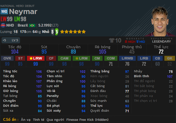 Neymar NHD +5 có một bộ chỉ số thống kê cực cao, một cảm giác rõ ràng của mọi người chơi sử dụng Neymar chính là ở sự mềm mại trong cách di chuyển của neymar. Được đánh giá ở khả năng rê bóng là rất dẻo,  tốc độ cực cao, khả năng sút dụng tốt cả 2 chân và khả năng xử lý kỹ thuật vô cùng hiệu quả. Với mức thẻ +5, Neymar thực sự là quá nhanh quá nguy hiểm. Điểm yếu duy nhất của Neymar chính là khả năng tranh chấp kém do thể hình và sức mạnh không cao. Mặc dù vậy Neymar NHD +5 vẫn là một quân bài cực kì hiệu quả bên hành lang cánh thay vì những top cầu thủ mùa TT có mức giá tương đương.