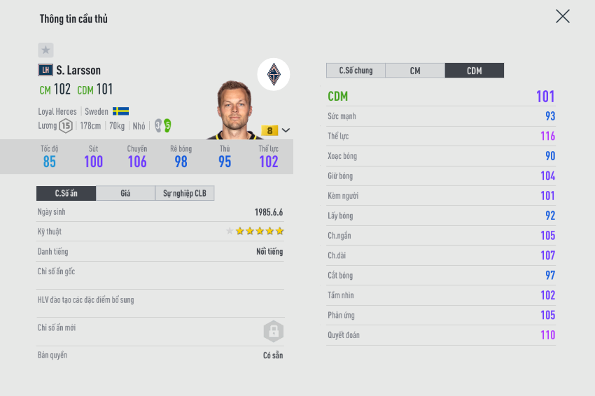 Vị trí khó lường nhất là cái tên Sebastian Larsson, đây là cầu thủ không xuất hiện nhiều ở máy chủ VN, nhưng được sử dụng trong team