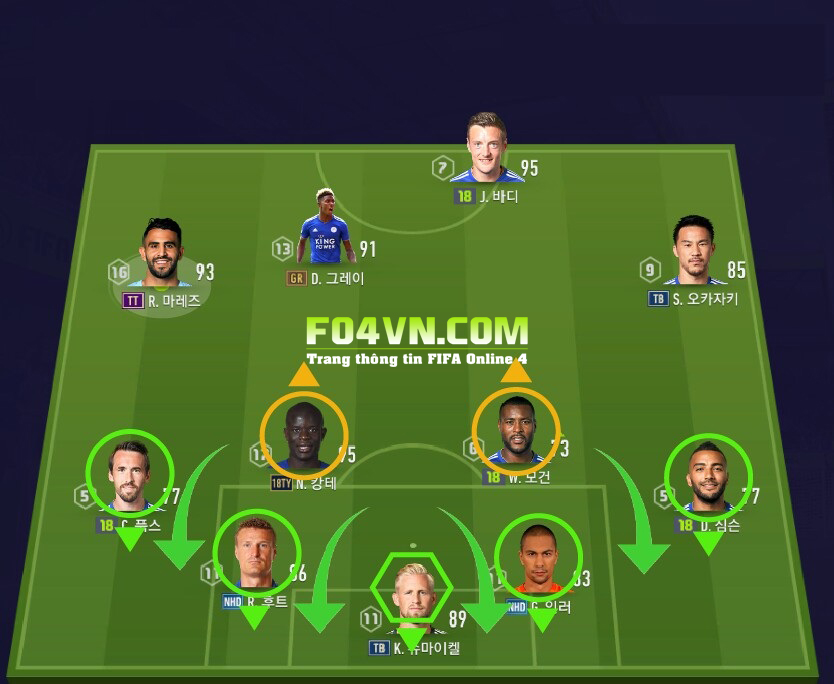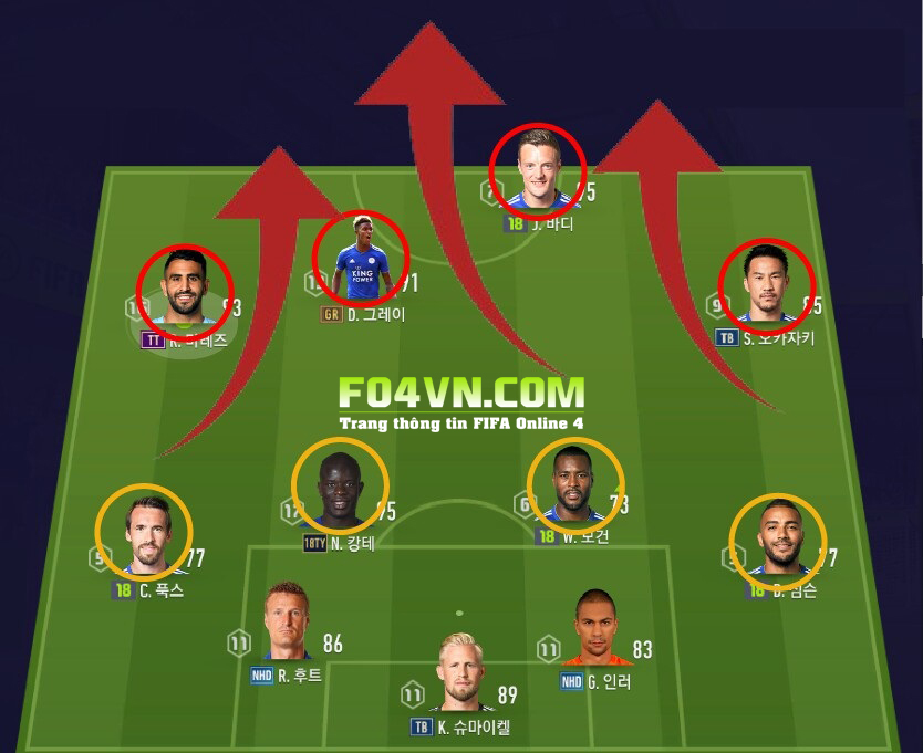 Với sơ đồ 4 tiền đạo. lối chơi nhanh tốc độ và tấn công dồn dập khiến đối phương lúng túng và mắc sai lầm chính là điểm mạnh của Leicester. Tận dụng những tiền đạo có tốc độ tốt như Vardy và Gray sẽ đem đến tối đa hiệu quả.