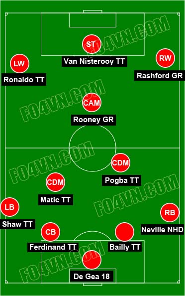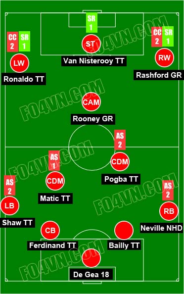 Lối chơi của MU sẽ thiên về việc sử dụng 2 cánh đầy tốc độ của mình. Cả Ronaldo và Rashford đều có khả năng xuyên phá cực tốt sau đó đi bóng vào trong. Tạt cho Van nisterooy hoặc nhả về tuyến 2 cho Rooney và Pogba. Dóng vai trò một ngòi nổ và người sẵn sàng tung ra những cú đại bác tầm xa. Bạn hạn chế ban bật trung lộ bởi Van Nisterooy không mạnh lắm trong những pha bật nhả và thường lùi về khá sâu. Bảng chiến thuật đội