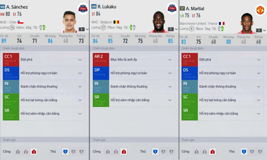 RW / Martial ss17 : điểm mạnh của cầu thủ trẻ người Pháp là tốc độ, bạn hãy cầm Martial sau đó đẩy bóng dài rồi bật tốc chạy lên để cảm nhận sự khác biệt. Tuy nhiên tránh chỉ định nếu đối phương dùng những thần chạy như carlos bên kia chiến tuyến. Lối đá của Martial trong đội hình này là chạy và tạt.