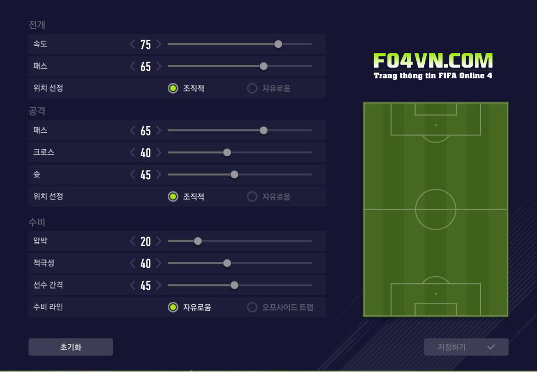 Với những cái tên có khả năng tấn công hàng đầu game với lối chơi di chuyển tốc độ. Thiết lập tốc độ cao trên mức trung bình sẽ đẩy mạnh khả năng di chuyển xâm nhập khi tấn công. Chuyền bóng 65 kéo rộng cự li của đội hình đặc biệt là 2 vị trí cánh sẽ được kéo rộng ra sát biên.
