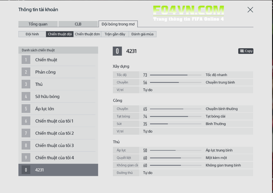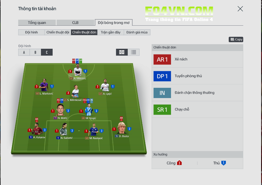 Sơ đồ 4-4-1-1 : Leo xếp hạng song song Sơ đồ 4-1-3-2 : Taca dada Team Allstar VfL Wolfsburg Sơ đồ 4-4-2 : Tấn công tổng lực Sơ đồ 4-1-2-3 : Leo rank Thách đấu