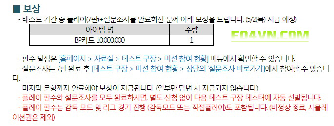 - Sau khi hoàn thành thử nghiệm test gameplay, bạn sẽ nhận được phần quà là 10 triệu BP. cùng với đó là những phần quà thẻ cầu thủ được nêu ở trên.